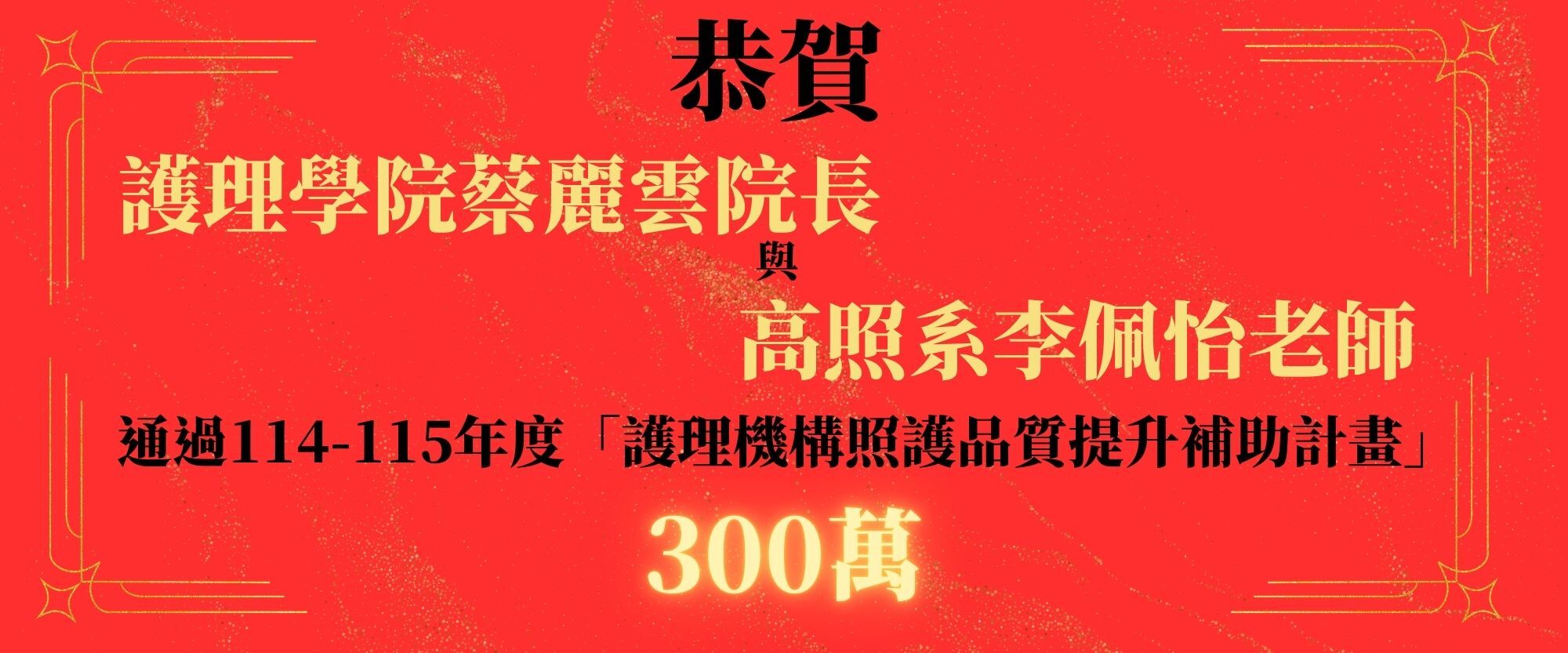 恭賀 護理學院蔡麗雲院長與高照系李佩怡老師通過114-115年度護理機構照護品質提升補助計畫300萬元