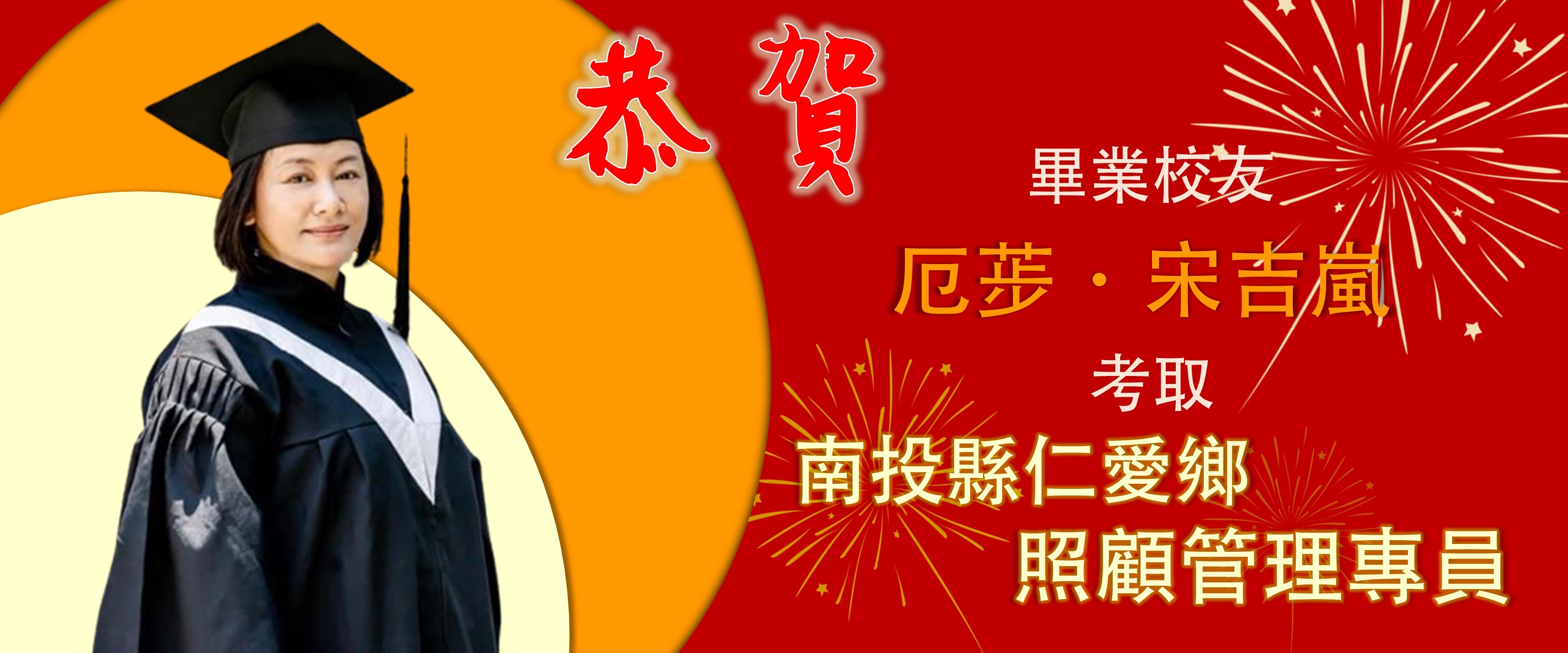恭賀 畢業校友 厄荹 ‧ 宋吉嵐 考取南投縣仁愛鄉照顧管理專員