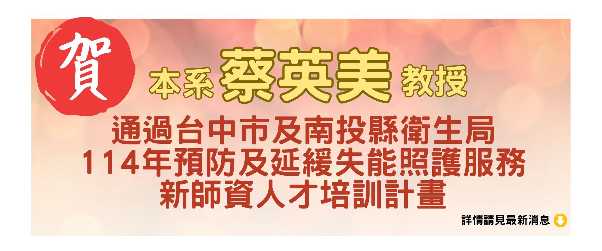 恭賀 高齡健康照護系蔡英美老師通過臺中市及南投縣衛生局114年預防及延緩失能照護服務新師資人才培訓計畫